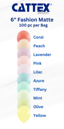 Cattex Fashion Matte Colour Palette 6" & 12" Explore the complete range of matte colours available in this stunning 12-inch latex balloon palette. - Coral - Peach - Lavender - Pink - Lilac - Azure - Tiffany - Mint - Olive - Yellow